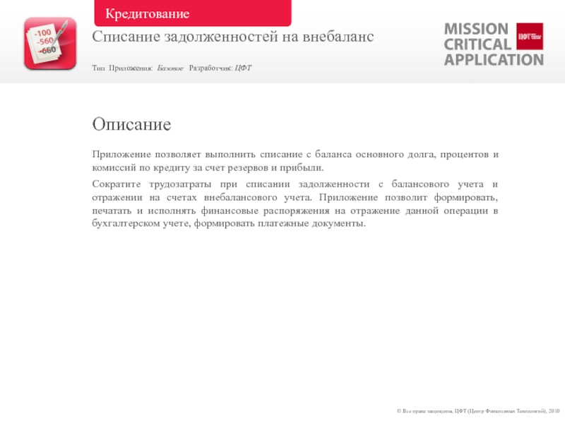 Приложение позволяет выполнить списание с баланса основного долга, процентов и комиссий по кредиту за счет резервов и прибыли.