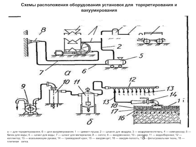 б — для вакуумирования; 1 — цемент-пушка; 2 — шланги для воздуха; 3 — воздухоочиститель; 4 — компрессор; 5 — бачок для воды; 6 — шланг для воды; 7 — шланг для материалов; 8 — сопло; 9 — вакуум-насос; 10 – ресивер; 11 — водосборники; 12 — коллектор; 13 — всасывающие рукава; 14 — трехходовой кран; 15 — вакуум-щит; 16 — вакуум-полость; 17 — фильтровальная ткань; 18 — плетеная сетка.