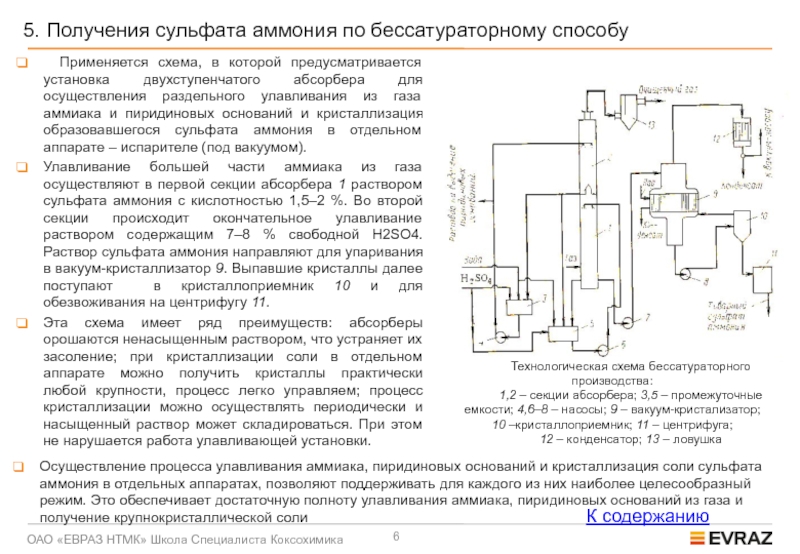 Осуществление процесса улавливания аммиака, пиридиновых оснований и кристаллизация соли сульфата аммония в отдельных аппаратах, позволяют поддерживать для каждого из них наиболее целесообразный режим. Это обеспечивает достаточную полноту улавливания аммиака, пиридиновых оснований из газа и получение крупнокристаллической соли