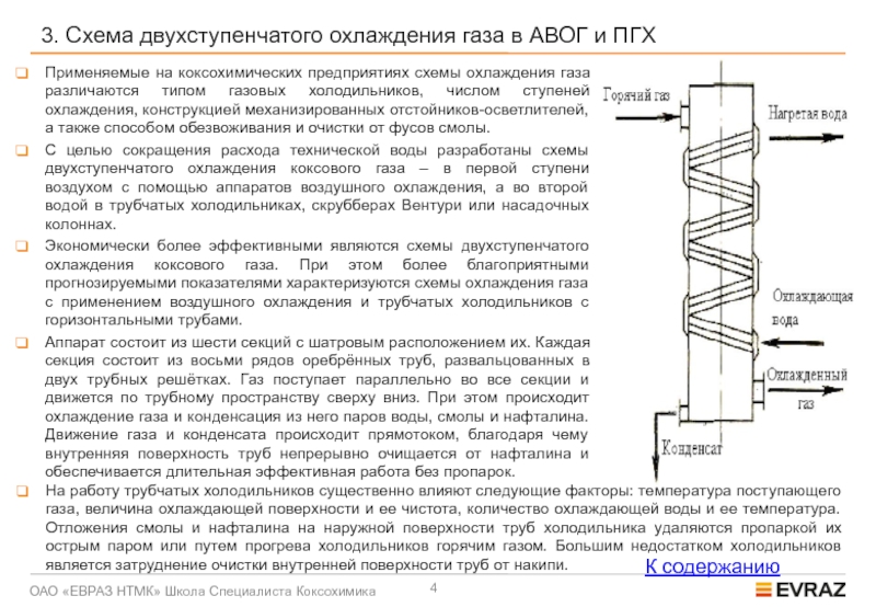 На работу трубчатых холодильников существенно влияют следующие факторы: температура поступающего газа, величина охлаждающей поверхности и ее чистота, количество охлаждающей воды и ее температура. Отложения смолы и нафталина на наружной поверхности труб холодильника удаляются пропаркой их острым паром или путем прогрева холодильников горячим газом. Большим недостатком холодильников является затруднение очистки внутренней поверхности труб от накипи.