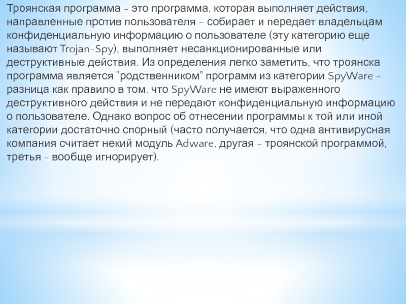 Слайд 12Троянская программа - это программа, которая выполняет действия, направленные против пользователя