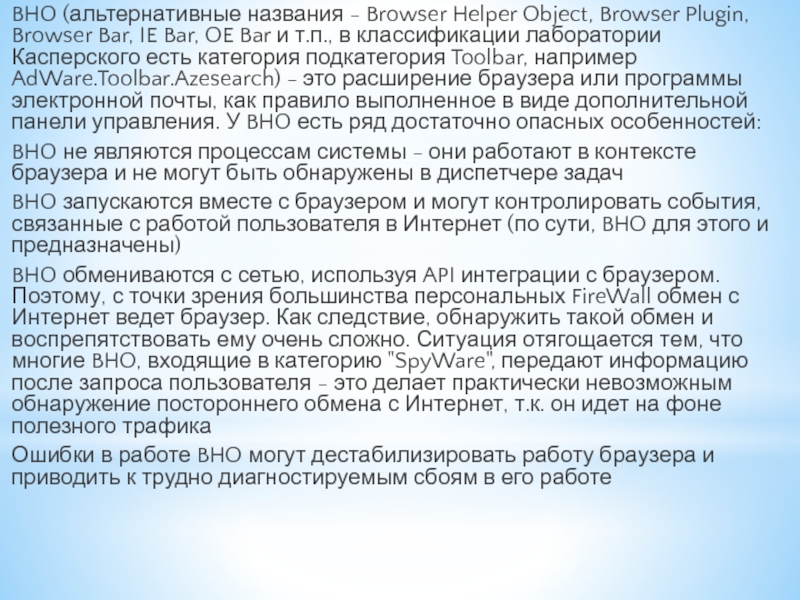 Слайд 11BHO (альтернативные названия - Browser Helper Object, Browser Plugin, Browser Bar,