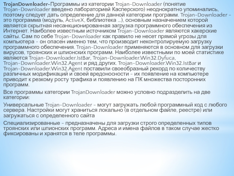 Слайд 10TrojanDownloader-Программы из категории Trojan-Downloader (понятие Trojan-Downloader введено лабораторией Касперского) неоднократно упоминались,