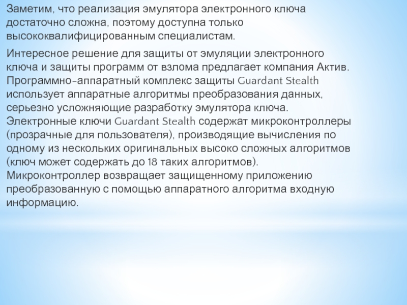 Интересное решение для защиты от эмуляции электронного ключа и защиты программ от взлома предлагает компания Актив. Программно-аппаратный комплекс защиты Guardant Stealth использует аппаратные алгоритмы преобразования данных, серьезно усложняющие разработку эмулятора ключа. Электронные ключи Guardant Stealth содержат микроконтроллеры (прозрачные для пользователя), производящие вычисления по одному из нескольких оригинальных высоко сложных алгоритмов (ключ может содержать до 18 таких алгоритмов). Микроконтроллер возвращает защищенному приложению преобразованную с помощью аппаратного алгоритма входную информацию.