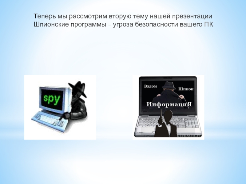 Слайд 8Теперь мы рассмотрим вторую тему нашей презентации Шпионские программы - угроза