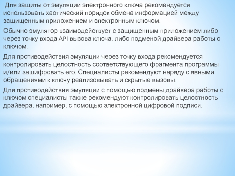 Слайд 6 Для защиты от эмуляции электронного ключа рекомендуется использовать хаотический порядок