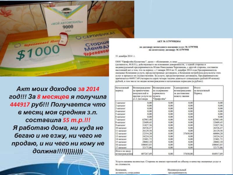 Слайд 17Акт моих доходов за 2014 год!!! За 8 месяцев я получила