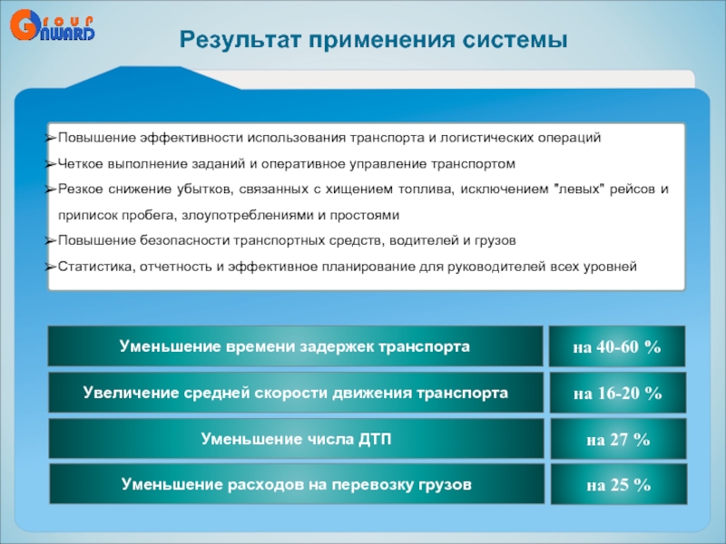 Контроль маршрута движения, посещения маршрутных точек, контроль груза (веса, объема), фиксация фактов погрузки, выгрузки, открытия дверей, несанкционированного перевоза груза.