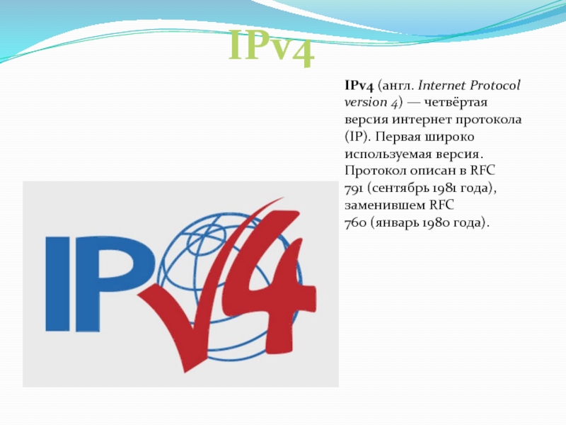 IPv4 (англ. Internet Protocol version 4) — четвёртая версия интернет протокола (IP). Первая широко