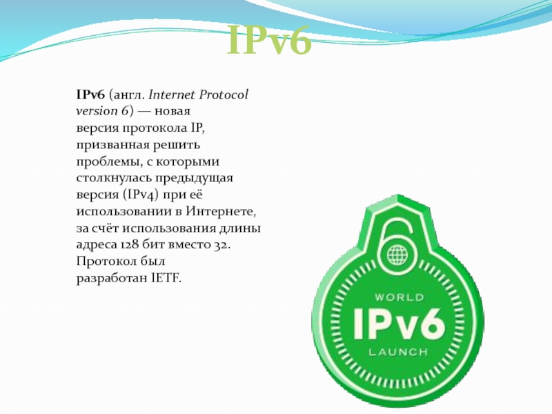 столкнулась предыдущая версия (IPv4) при её использовании в Интернете, за счёт использования длины адреса 128 бит вместо 32. Протокол был разработан IETF.