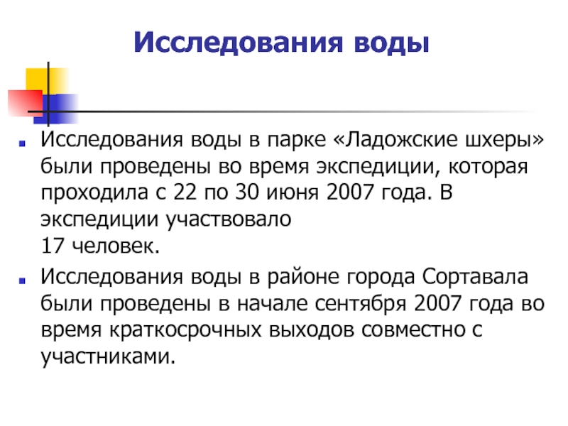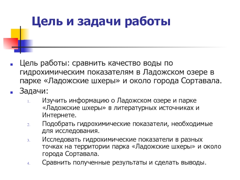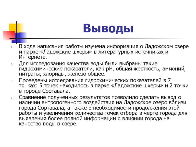 Исследовать гидрохимические показатели в разных точках на территории парка «Ладожские шхеры» и около города Сортавала.