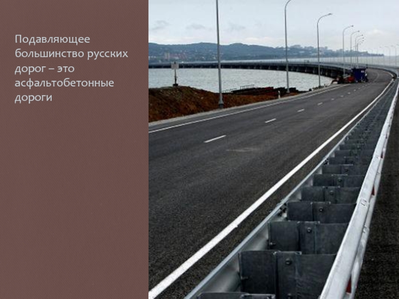 Слайд 6Подавляющее большинство русских дорог – это асфальтобетонные дороги
