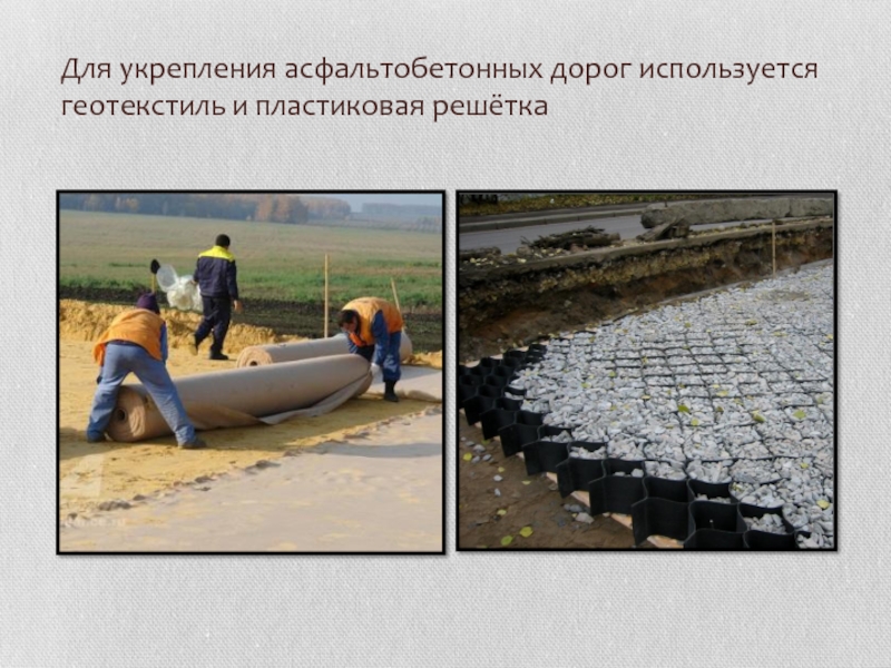 Слайд 9Для укрепления асфальтобетонных дорог используется геотекстиль и пластиковая решётка
