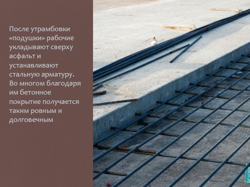 Слайд 13После утрамбовки «подушки» рабочие укладывают сверху асфальт и устанавливают стальную арматуру.
