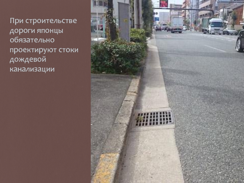 Слайд 17При строительстве дороги японцы обязательно проектируют стоки дождевой канализации