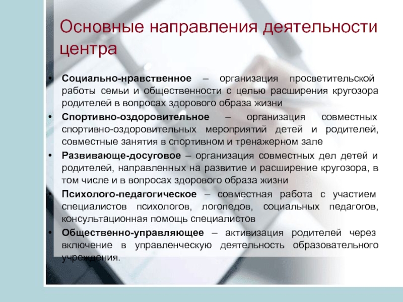 Спортивно-оздоровительное – организация совместных спортивно-оздоровительных мероприятий детей и родителей, совместные занятия в спортивном и тренажерном зале