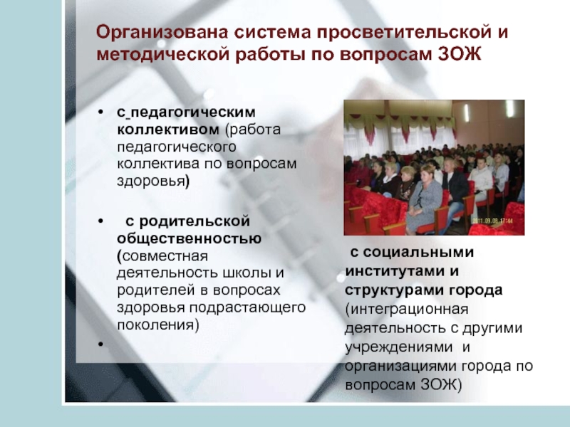 Слайд 56Организована система просветительской и методической работы по вопросам ЗОЖ