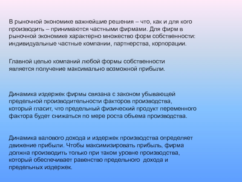 Динамика издержек фирмы связана с законом убывающей предельной производительности факторов производства, который гласит, что предельный физический продукт переменного фактора будет снижаться по мере роста объема производства.