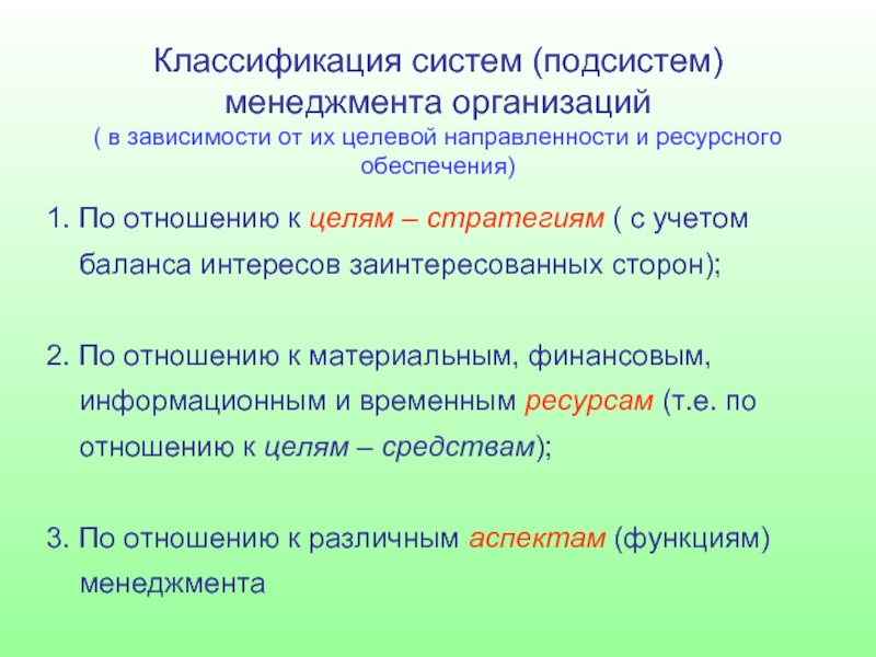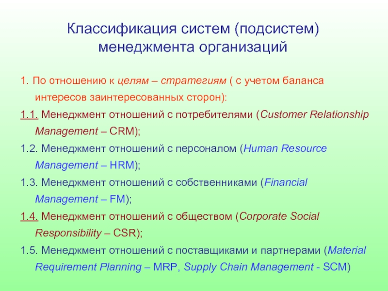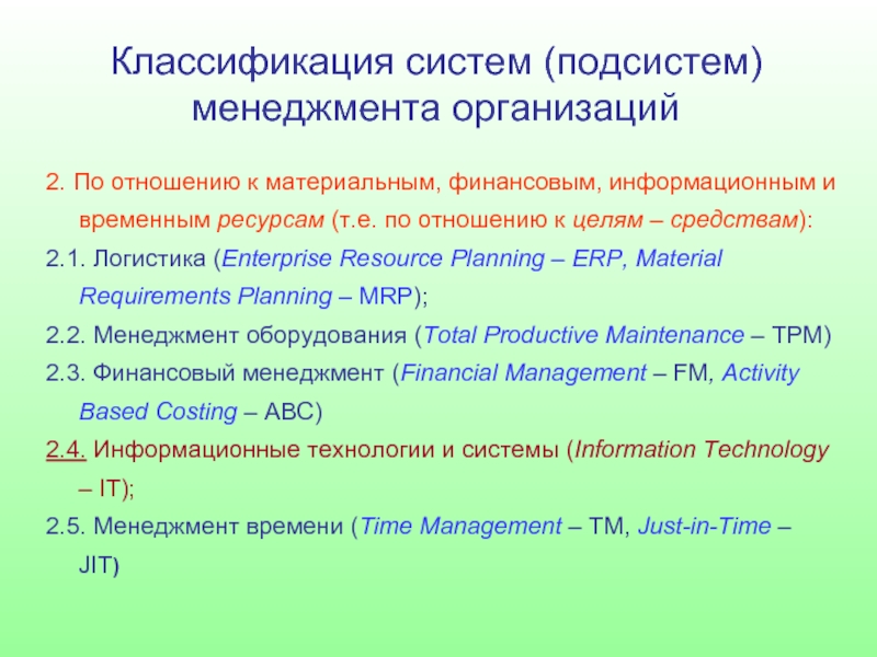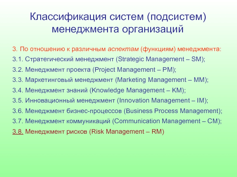 Слайд 44Классификация систем (подсистем) менеджмента организаций