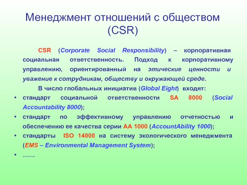 Слайд 40Менеджмент отношений с обществом (CSR)