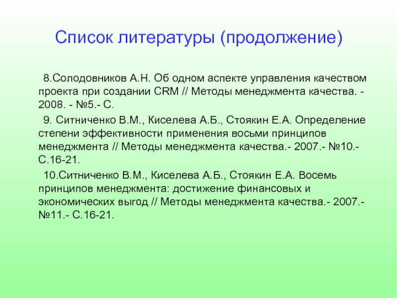 9. Ситниченко В.М., Киселева А.Б., Стоякин Е.А. Определение степени эффективности применения восьми принципов менеджмента // Методы менеджмента качества.- 2007.- №10.- С.16-21.