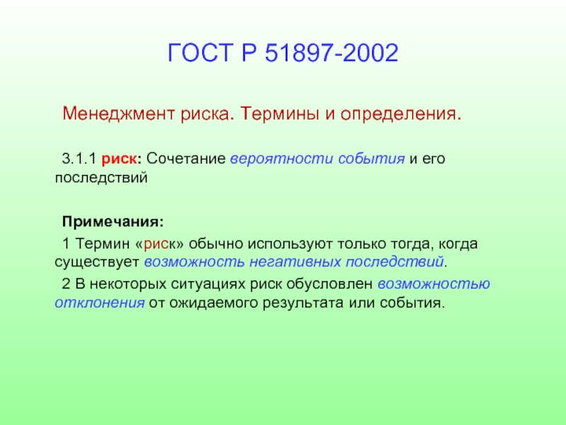 1 Термин «риск» обычно используют только тогда, когда существует возможность негативных последствий.