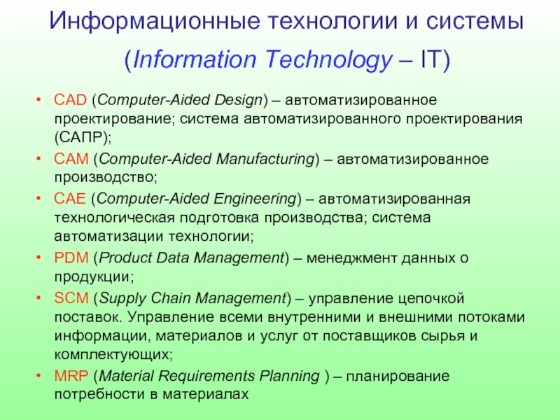 SCM (Supply Chain Management) – управление цепочкой поставок. Управление всеми внутренними и внешними потоками информации, материалов и услуг от поставщиков сырья и комплектующих;