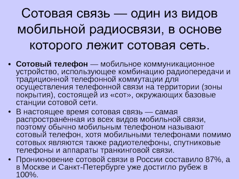 Сотовый телефон — мобильное коммуникационное устройство, использующее комбинацию радиопередачи и традиционной телефонной коммутации для осуществления телефонной связи на территории (зоны покрытия), состоящей из «сот», окружающих базовые станции сотовой сети.