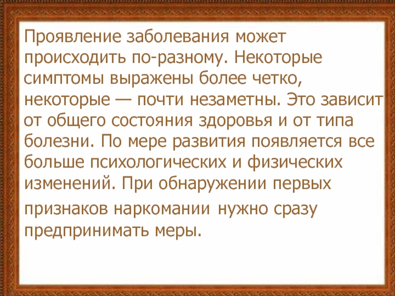 Проявление заболевания может происходить по-разному. Некоторые симптомы выражены более четко, некоторые — почти незаметны. Это зависит от общего состояния здоровья и от типа болезни. По мере развития появляется все больше психологических и физических изменений. При обнаружении первых признаков наркомании нужно сразу предпринимать меры.
