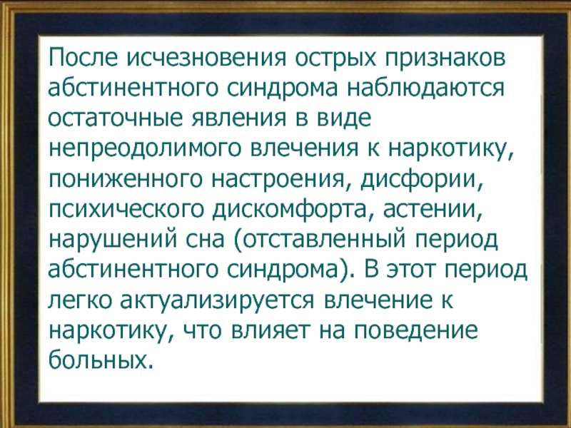 После исчезновения острых признаков абстинентного синдрома наблюдаются остаточные явления в виде непреодолимого влечения к наркотику, пониженного настроения, дисфории, психического дискомфорта, астении, нарушений сна (отставленный период абстинентного синдрома). В этот период легко актуализируется влечение к наркотику, что влияет на поведение больных.