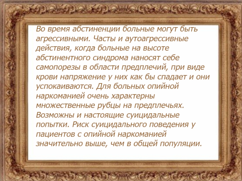 Во время абстиненции больные могут быть агрессивными. Часты и аутоагрессивные действия, когда больные на высоте абстинентного синдрома наносят себе самопорезы в области предплечий, при виде крови напряжение у них как бы спадает и они успокаиваются. Для больных опийной наркоманией очень характерны множественные рубцы на предплечьях. Возможны и настоящие суицидальные попытки. Риск суицидального поведения у пациентов с опийной наркоманией значительно выше, чем в общей популяции.