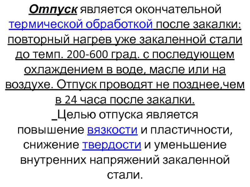 после закалки: повторный нагрев уже закаленной стали до темп. 200-600 град. с последующем охлаждением в воде, масле или на воздухе. Отпуск проводят не позднее,чем в 24 часа после закалки.