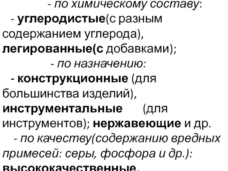 - углеродистые(с разным содержанием углерода), легированные(с добавками);