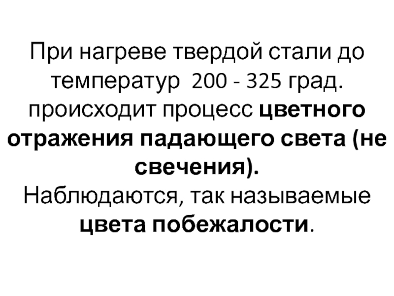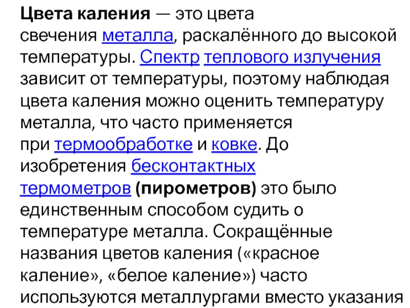 Слайд 12Цвета каления — это цвета свечения металла, раскалённого до высокой температуры. Спектр теплового излучения зависит