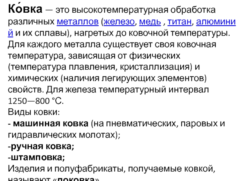 Слайд 21Ко́вка — это высокотемпературная обработка различных металлов (железо, медь , титан, алюминий и их сплавы), нагретых до ковочной температуры.