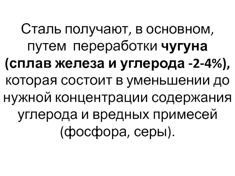 Слайд 3Сталь получают, в основном, путем переработки чугуна (сплав железа и углерода