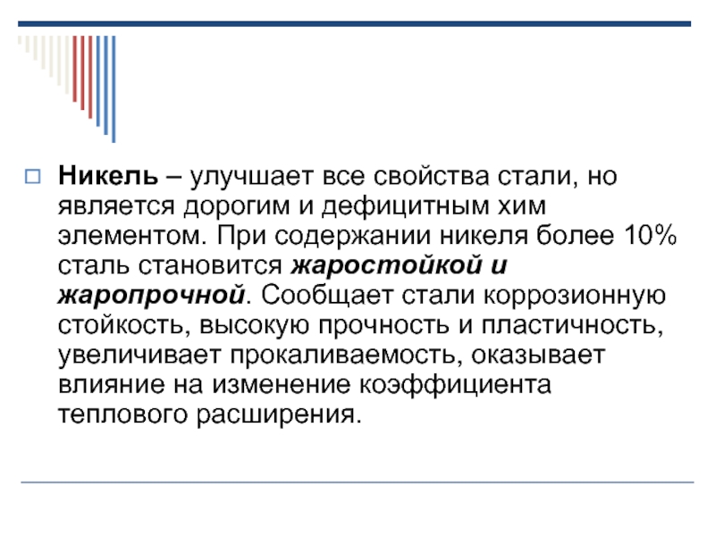 Слайд 11Никель – улучшает все свойства стали, но является дорогим и дефицитным