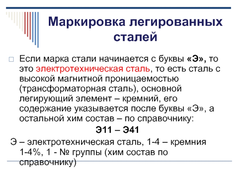 Э – электротехническая сталь, 1-4 – кремния 1-4%, 1 - № группы (хим состав по справочнику)