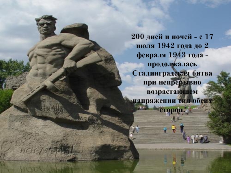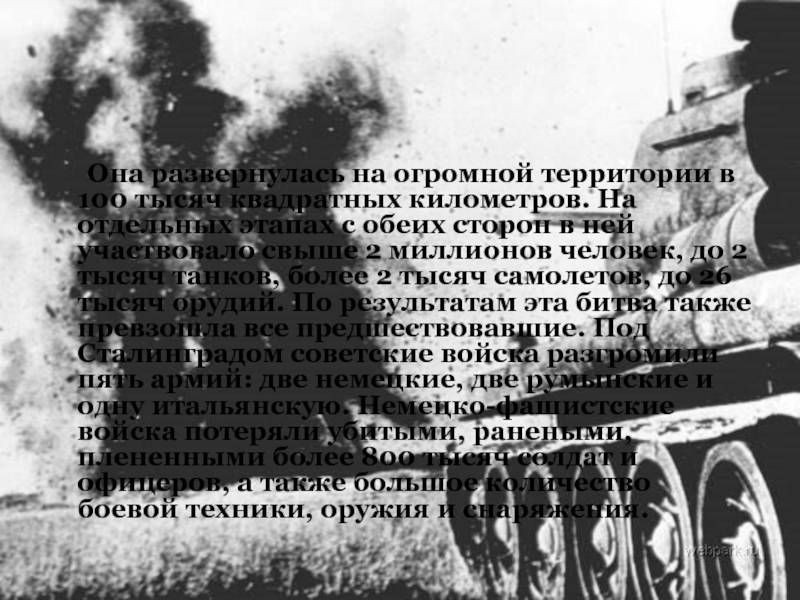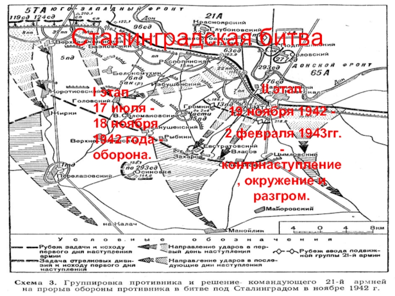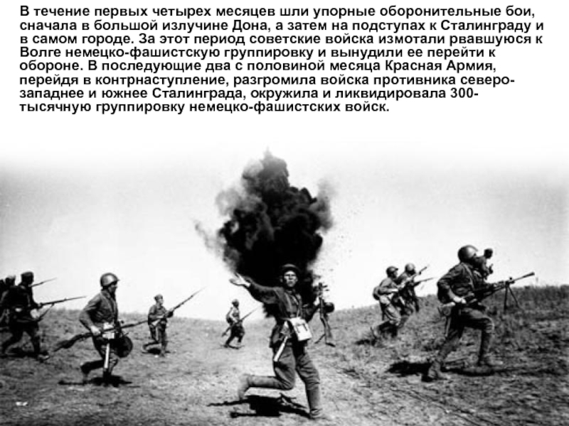 В течение первых четырех месяцев шли упорные оборонительные бои, сначала в большой излучине Дона, а затем на подступах к Сталинграду и в самом городе. За этот период советские войска измотали рвавшуюся к Волге немецко-фашистскую группировку и вынудили ее перейти к обороне. В последующие два с половиной месяца Красная Армия, перейдя в контрнаступление, разгромила войска противника северо-западнее и южнее Сталинграда, окружила и ликвидировала 300-тысячную группировку немецко-фашистских войск.