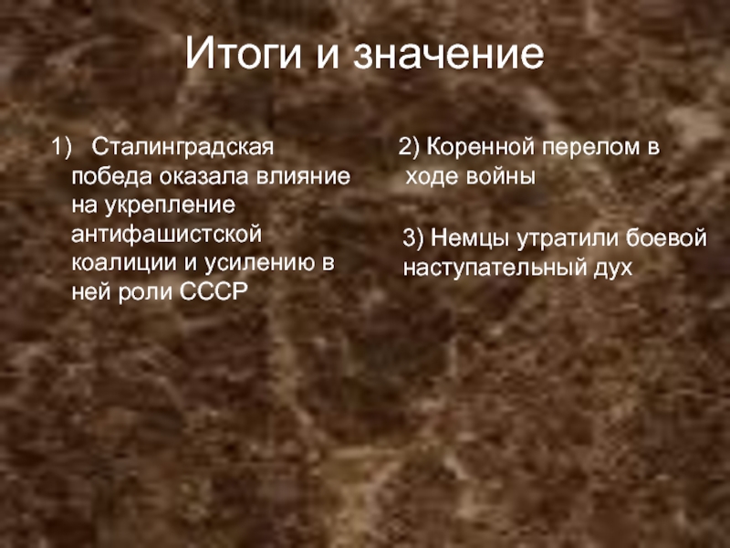 Опираясь на всенародную поддержку, на крепкий тыл и неисчерпаемые ресурсы социалистического государства, Красная Армия не только выдержала натиск опасного и сильного противника, но и в ходе оборонительных сражений усилило свою мощь, а затем добилась коренного перелома в тяжелой борьбе.
