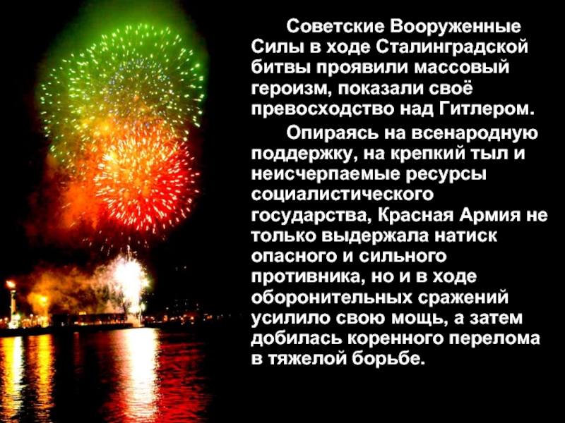 Советские Вооруженные Силы в ходе Сталинградской битвы проявили массовый героизм, показали своё превосходство над Гитлером.