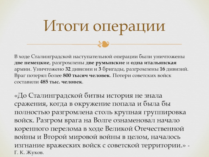 «До Сталинградской битвы история не знала сражения, когда в окружение попала и была бы полностью разгромлена столь крупная группировка войск. Разгром врага на Волге ознаменовал начало коренного перелома в ходе Великой Отечественной войны и Второй мировой войны в целом, началось изгнание вражеских войск с советской территории.» - Г. К. Жуков.
