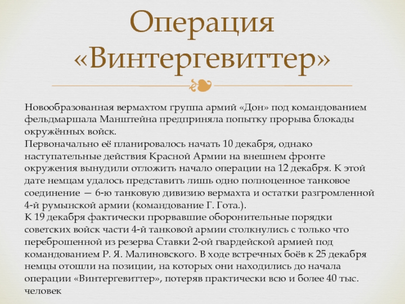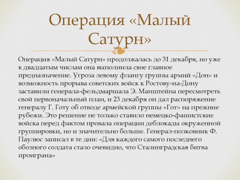 к двадцатым числам она выполнила свое главное предназначение. Угроза левому флангу группы армий «Дон» и возможность прорыва советских войск к Ростову-на-Дону заставили генерала-фельдмаршала Э. Манштейна пересмотреть свой первоначальный план, и 23 декабря он дал распоряжение генералу Г. Готу об отводе армейской группы «Гот» на прежние рубежи. Это решение не только ставило немецко-фашистские войска перед фактом провала операции деблокады окруженной группировки, но и значительно больше. Генерал-полковник Ф. Паулюс записал в те дни: «Для каждого самого последнего обозного солдата стало очевидно, что Сталинградская битва проиграна»