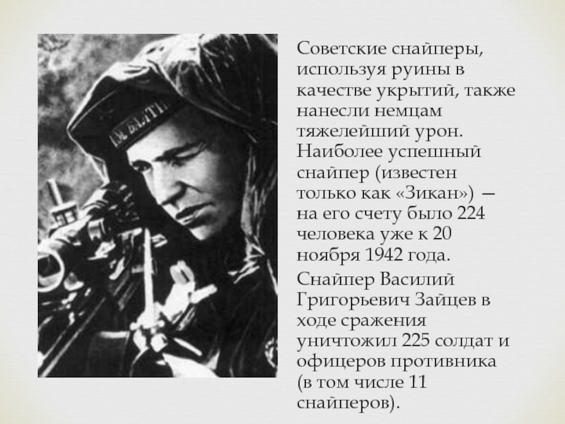 тяжелейший урон. Наиболее успешный снайпер (известен только как «Зикан») — на его счету было 224 человека уже к 20 ноября 1942 года.