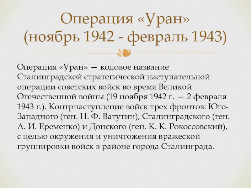 стратегической наступательной операции советских войск во время Великой Отечественной войны (19 ноября 1942 г. — 2 февраля 1943 г.). Контрнаступление войск трех фронтов: Юго-Западного (ген. Н. Ф. Ватутин), Сталинградского (ген. А. И. Еременко) и Донского (ген. К. К. Рокоссовский), с целью окружения и уничтожения вражеской группировки войск в районе города Сталинграда.