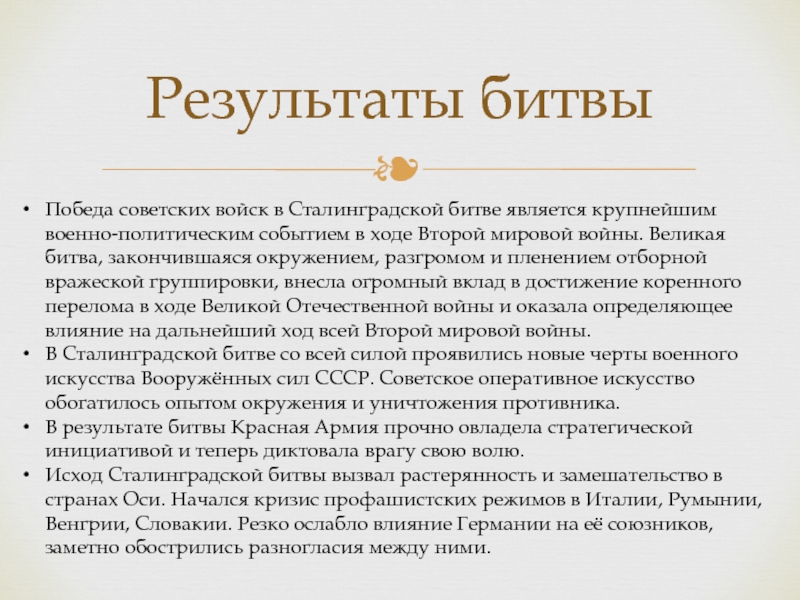 в ходе Второй мировой войны. Великая битва, закончившаяся окружением, разгромом и пленением отборной вражеской группировки, внесла огромный вклад в достижение коренного перелома в ходе Великой Отечественной войны и оказала определяющее влияние на дальнейший ход всей Второй мировой войны.