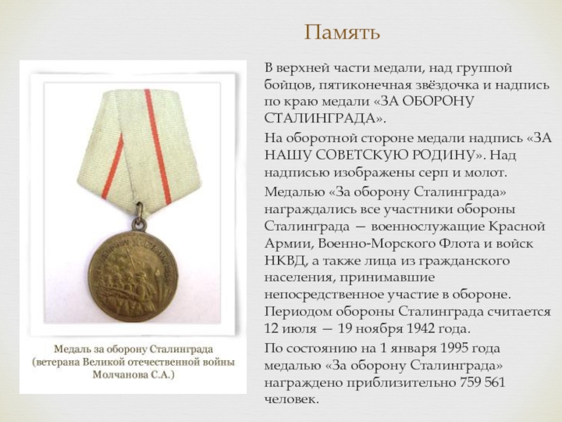 По состоянию на 1 января 1995 года медалью «За оборону Сталинграда» награждено приблизительно 759 561 человек.