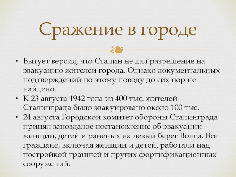 К 23 августа 1942 года из 400 тыс. жителей Сталинграда было эвакуировано около 100 тыс.