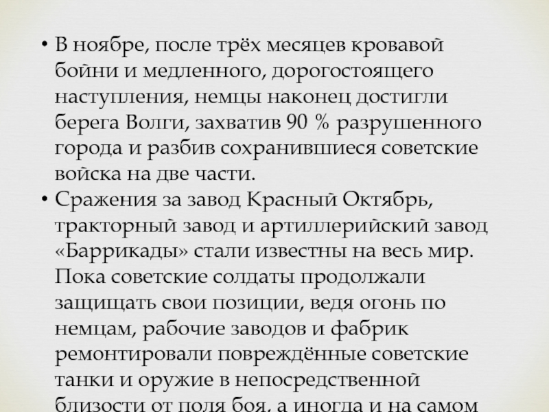 немцы наконец достигли берега Волги, захватив 90 % разрушенного города и разбив сохранившиеся советские войска на две части.