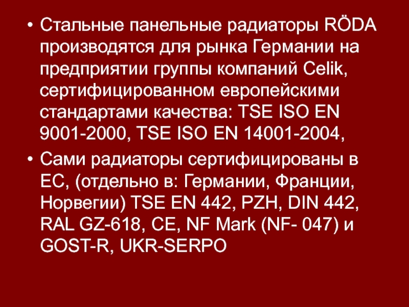 Слайд 8Стальные панельные радиаторы RÖDA производятся для рынка Германии на предприятии группы